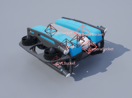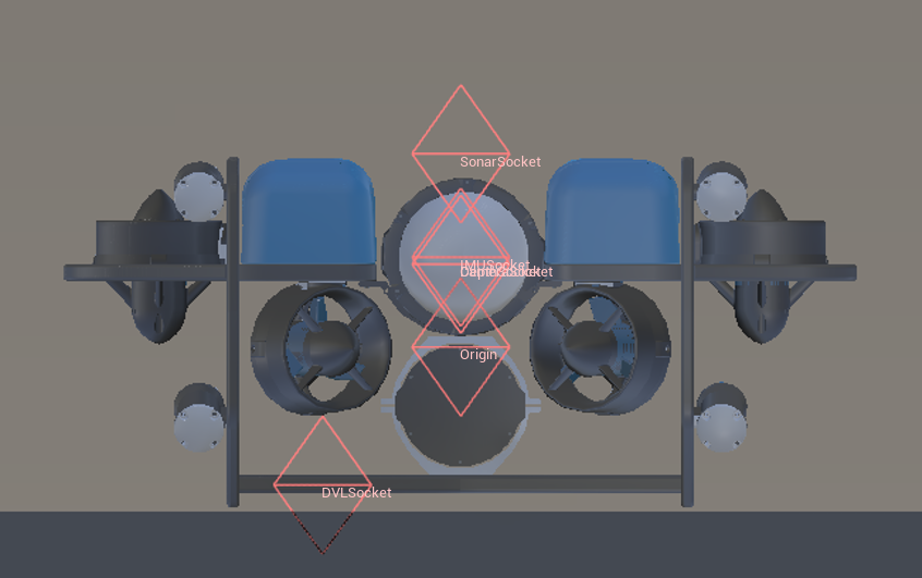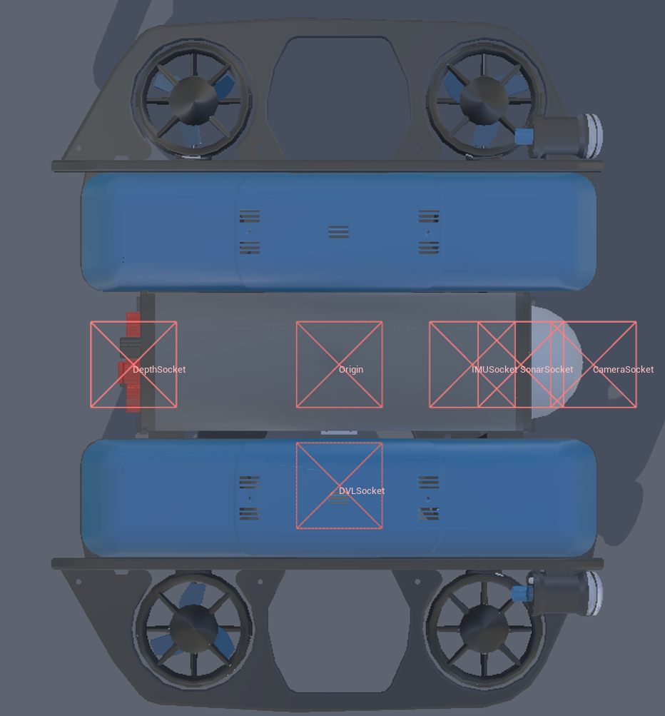 COMCenter of mass.SonarSocketLocation of the sonar sensor.DVLSocketLocation of the DVL.IMUSocketLocation of the IMU. Rotated 180 on x-axis (x points forward, y points right, z points down).DepthSocketLocation of the depth sensor.CameraSocketLocation of the camera.OriginTrue center of the robot.ViewportWhere the robot is viewed from.