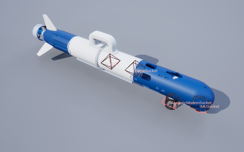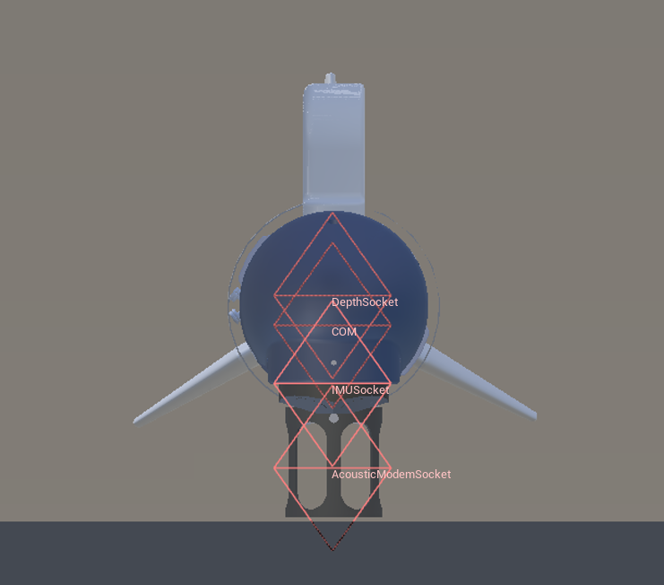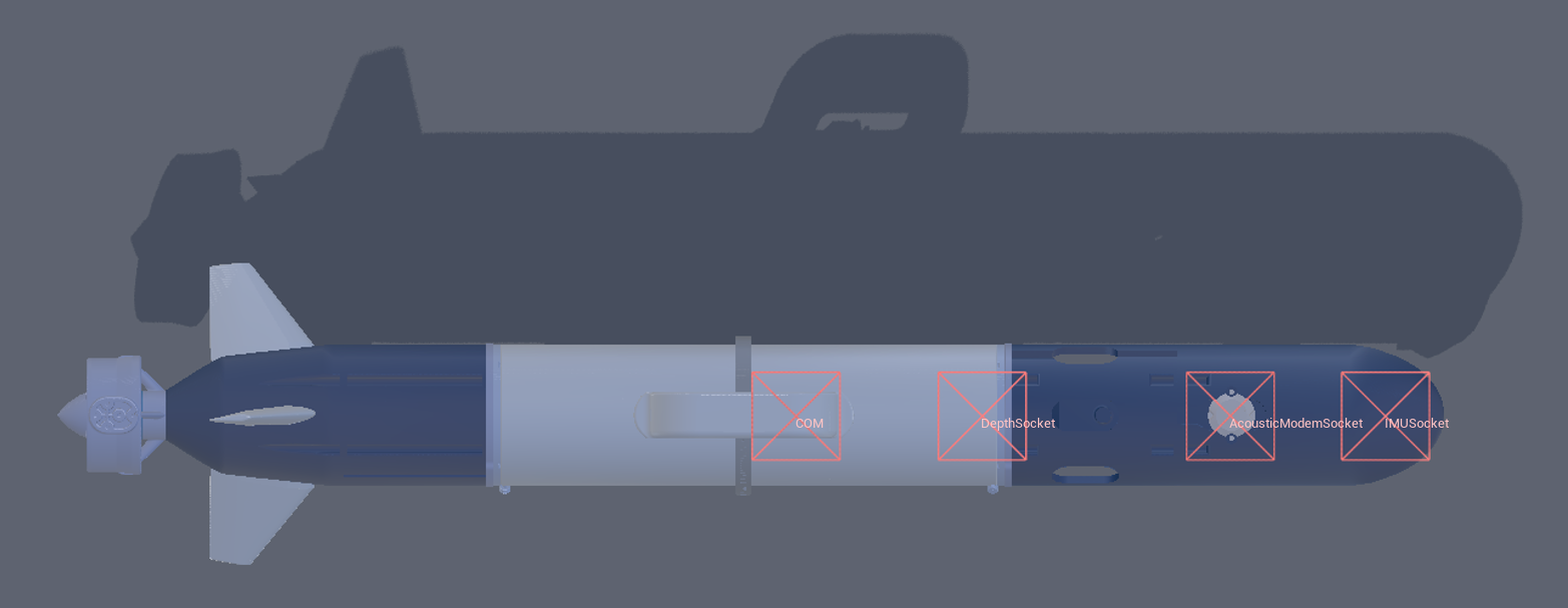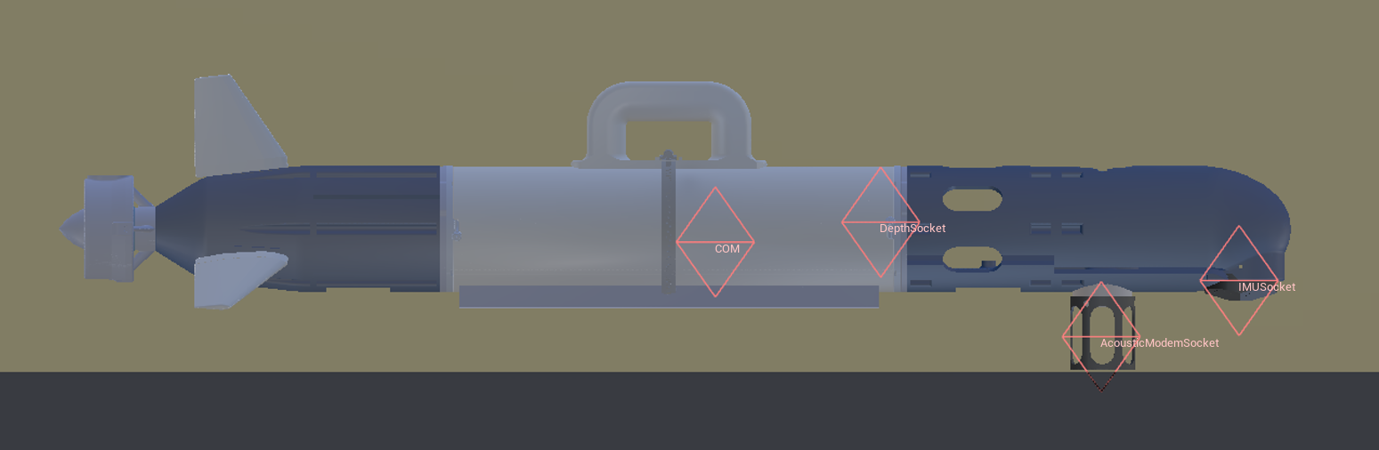 COMCenter of mass.DVLSocketLocation of the DVL. Rotated 180 degrees on x-axis (x points forward, y points right, z points down).IMUSocketLocation of the IMU. Rotated 180 degrees on x-axis (x points forward, y points right, z points down). Same location as DVL Socket.DepthSocketLocation of the depth sensor.AcousticModemSocketLocation of the acoustic modem.Viewportwhere the robot is viewed from.